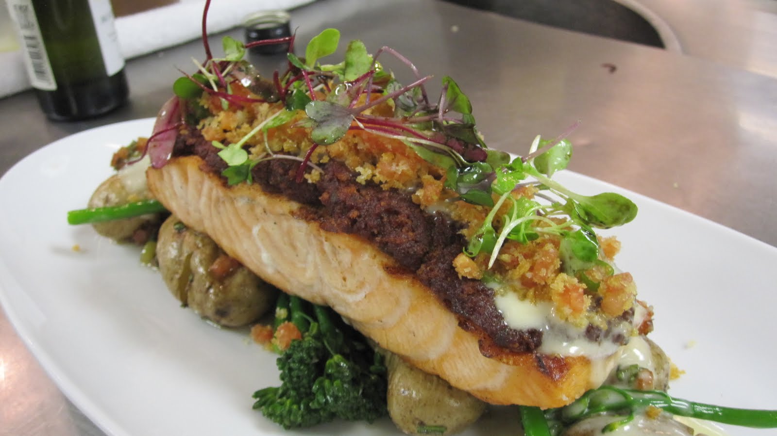 Bronzini, Grilled Local Sweet Onions, Arugula, Potato Puree, Oyster